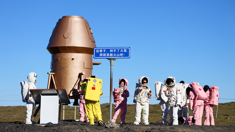 Turistas vestem trajes espaciais no Parque Vulcânico de Ulanhada