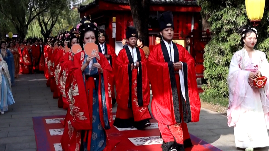 Noivos chineses e estrangeiros celebram casamento ao estilo tradicional chinês