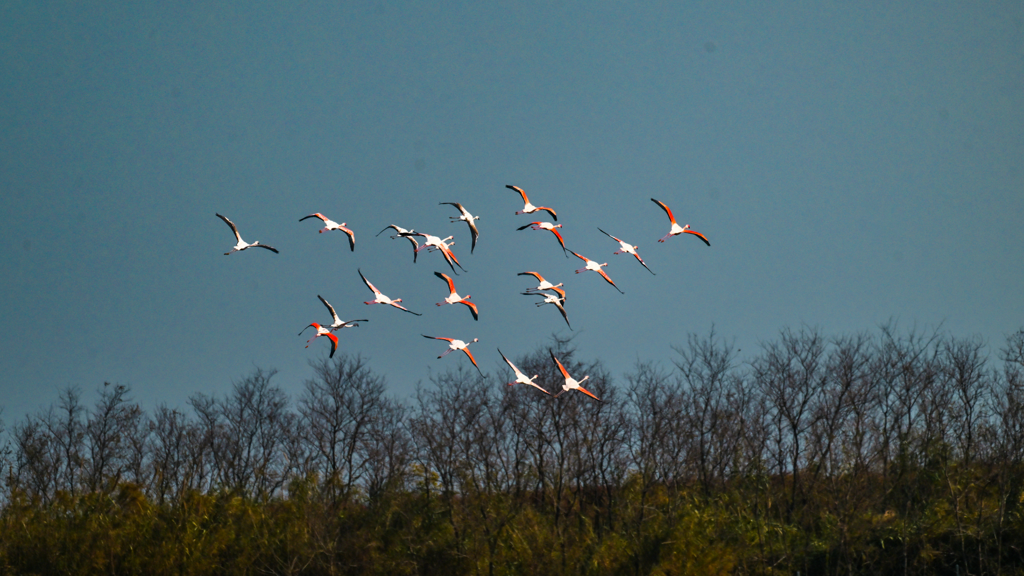 Flamingos chegam a pântano em Dongtai para passagem de inverno