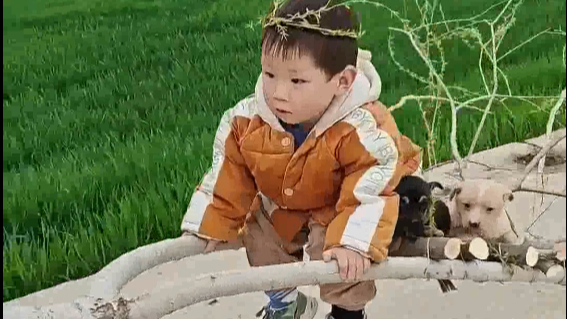 Pai constrói “palaquim de galhos” para levar filho e cachorrinhos para passear na primavera