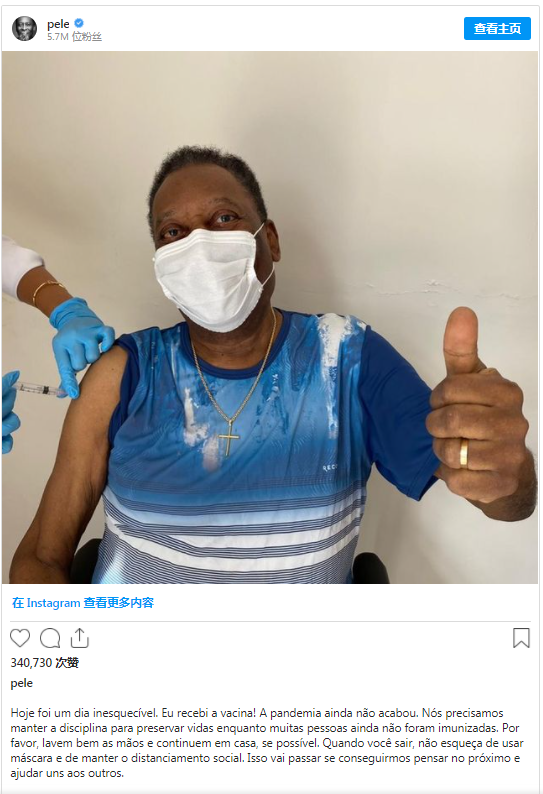 Pelé postou uma foto da vacinação nas redes sociais e disse que foi um dia inesquecível. “Eu recebi a vacina. A pandemia não acabou. Nós precisamos manter a disciplina para preservar vidas enquanto muitas pessoas ainda não foram imunizadas. Por favor, lavem bem as mãos e continuem em casa, se possível. Quando você sair, não esqueça de usar mascara e de manter o distanciamento social. Isso vai passar se conseguirmos pensar no próximo e ajudar uns aos outros”, disse Pelé.