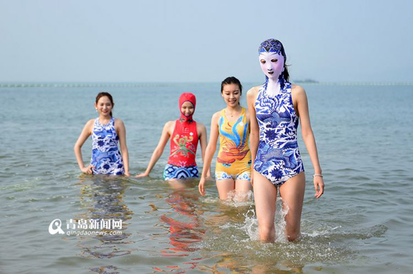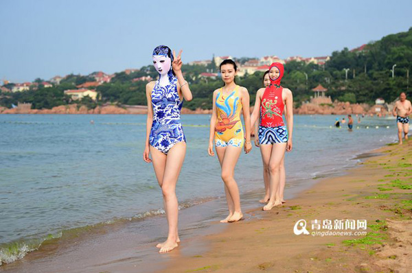Modelos com "facekini" atraem atenção em Qingdao