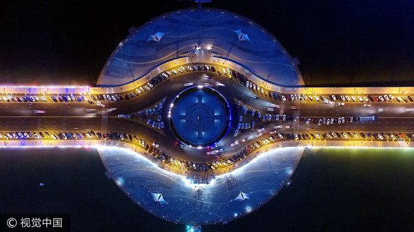Fotos apresentam a vista noturna de uma ponte com a forma de um relógio de pulso em Binzhou, na província de Shandong.