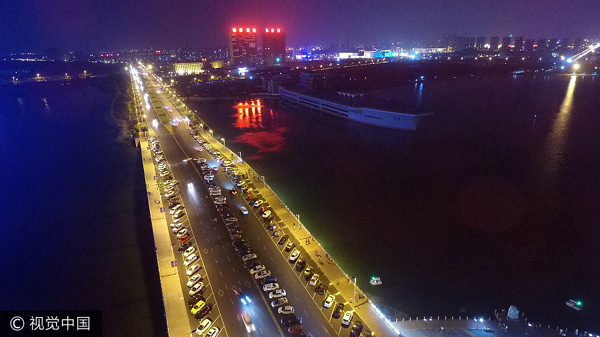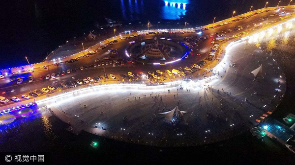 A ponte que se estende sobre o lago Zhonghai, uma das principais atrações da cidade, tornou-se um local popular que atrai milhares de habitantes locais nas noites quentes de verão.