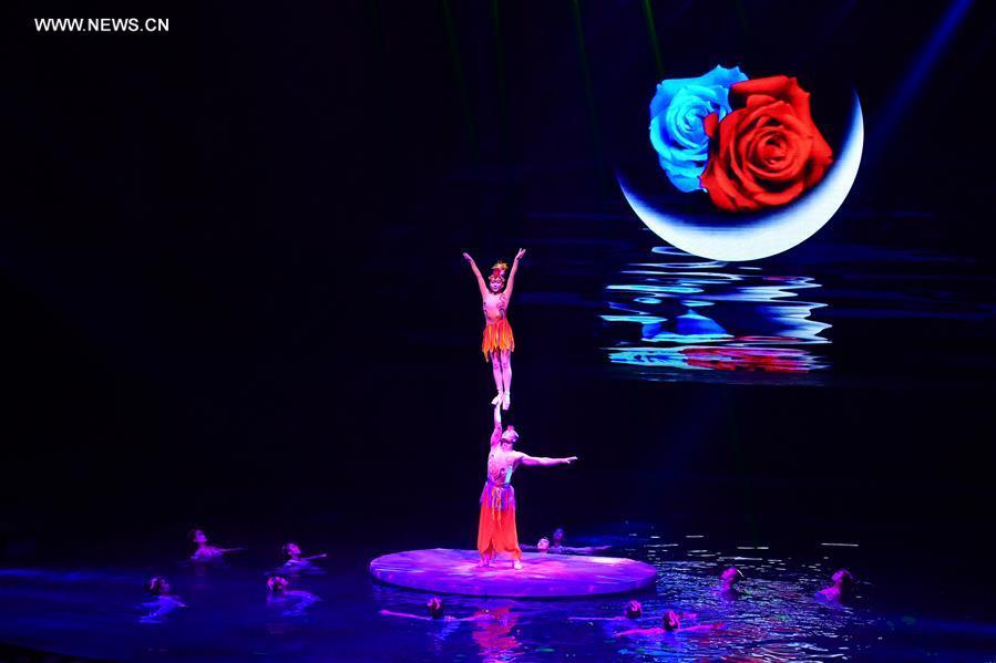 Uma das cenas em que os atores voam, durante o show de acrobacias chamado Water Show, em Puyang, na província de Henan, no centro de China, em 5 de setembro de 2017. Puyang é apelidado de berço das acrobacias chinesas tradicionais.