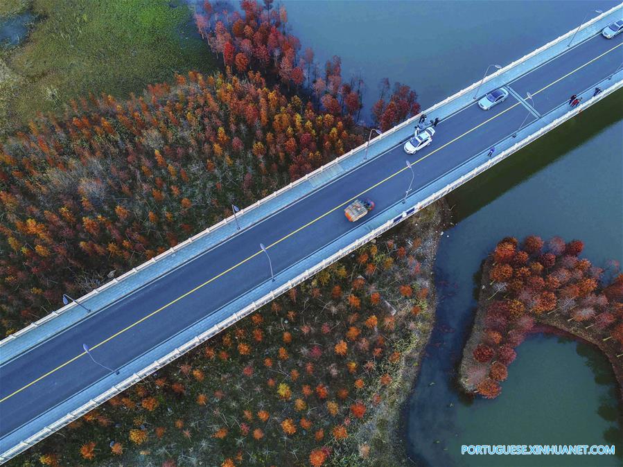 Foto aérea de 26 de novembro de 2017 mostra a paisagem de inverno do lago Tianquan em Xuyi, província de Jiangsu, no leste da China. (Xinhua/Tang Dehong)