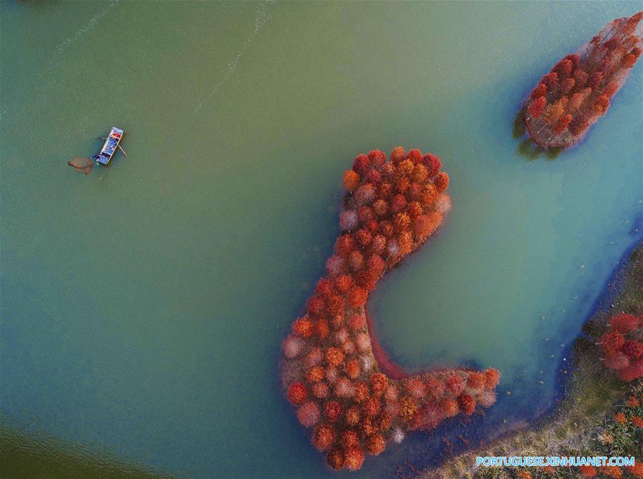 Foto aérea de 26 de novembro de 2017 mostra a paisagem de inverno do lago Tianquan em Xuyi, província de Jiangsu, no leste da China. (Xinhua/Tang Dehong)