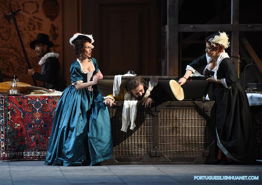 Atores interpretam a ópera Falstaff do compositor italiano Giuseppe Verdi durante um ensaio no Centro Nacional de Artes Performáticas de Beijing, capital da China, em 1º de dezembro de 2017. A ópera estreou no palcos no domingo.