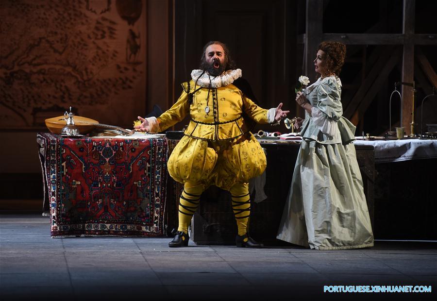 Atores interpretam a ópera Falstaff do compositor italiano Giuseppe Verdi durante um ensaio no Centro Nacional de Artes Performáticas de Beijing, capital da China, em 1º de dezembro de 2017. A ópera estreou no palcos no domingo.