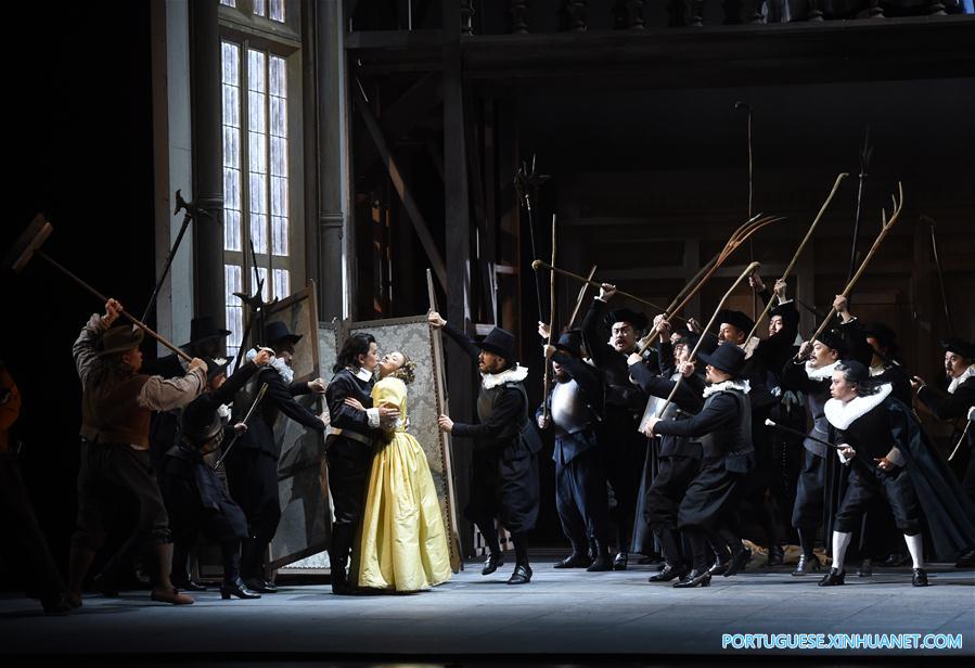 Atores interpretam a ópera Falstaff do compositor italiano Giuseppe Verdi durante um ensaio no Centro Nacional de Artes Performáticas de Beijing, capital da China, em 1º de dezembro de 2017. A ópera estreou no palcos no domingo.