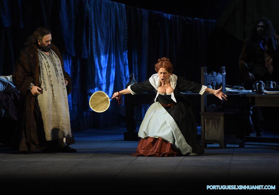Atores interpretam a ópera Falstaff do compositor italiano Giuseppe Verdi durante um ensaio no Centro Nacional de Artes Performáticas de Beijing, capital da China, em 1º de dezembro de 2017. A ópera estreou no palcos no domingo.