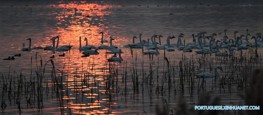 Cisnes brancos são alimentados em um pântano em Sanmenxia, província de Henan, no centro da China, em 3 de dezembro de 2017. Os cisnes brancos migratórios voam da Sibéria para passar o inverno no local.