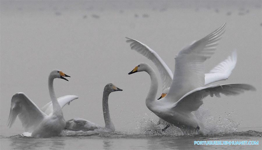 Cisnes brancos são alimentados em um pântano em Sanmenxia, província de Henan, no centro da China, em 3 de dezembro de 2017. Os cisnes brancos migratórios voam da Sibéria para passar o inverno no local.