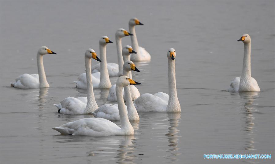 Cisnes brancos são alimentados em um pântano em Sanmenxia, província de Henan, no centro da China, em 3 de dezembro de 2017. Os cisnes brancos migratórios voam da Sibéria para passar o inverno no local.