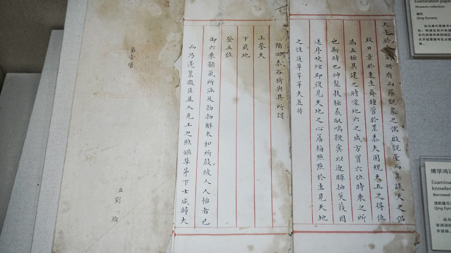 O pavilhão de exames de escrita Jiangnan está situado na cidade de Nanjing, província de Jiangsu, leste da China. No seu auge, o pavilhão ocupava uma área de 30 quilômetros quadrados e possuía 20.644 compartimentos onde eram aplicados os testes. A história milenar da examinação imperial se caracteriza por competição aberta e justa, compondo a esplêndida cultura chinesa.