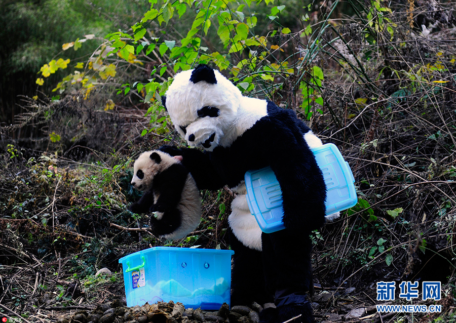 Qual é o primeiro passo para ser um criador de pandas? – Fingir-se de panda! Trabalhadores totalmente fantasiados realizaram um teste físico com um filhotinho em Wolong, em Sichuan. A zona é uma das principais bases de proteção ao animal da China.