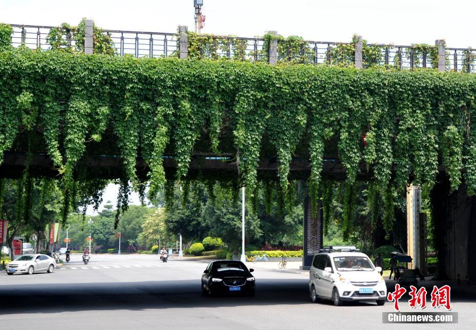 Um viaduto na cidade chinesa de Fuzhou está coberto de vegetação, o que ajuda a manter a limpeza e o frescor na zona.