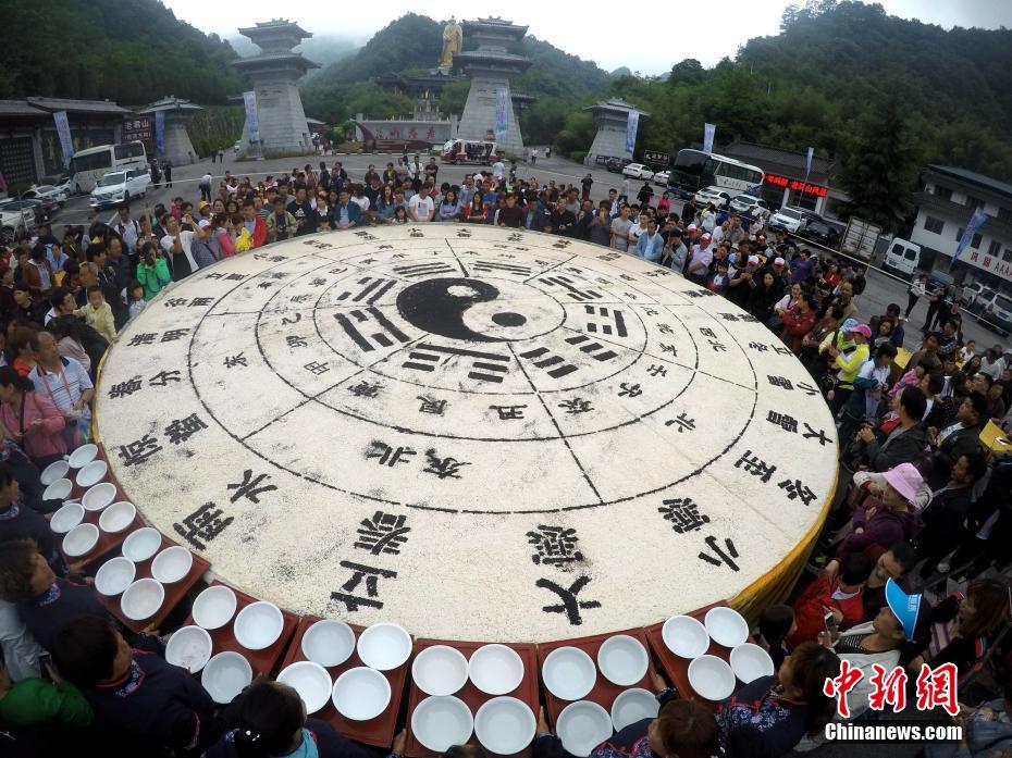 Um total de 1550 quilogramas de soja foram usados para fazer um tofu de 3500 quilos, decorado com caracteres chineses, símbolos dos 24 termos solares, e com o símbolo “yin e yang”. A 19 de maio de 2018, cerca de 10 mil visitantes compartilharam o alimento na montanha Laojun, na cidade de Luoyang, província de Henan, conhecida pela sua herança cultural relacionada com o taoísmo. (Foto: China News Service/Wang Zhongju)