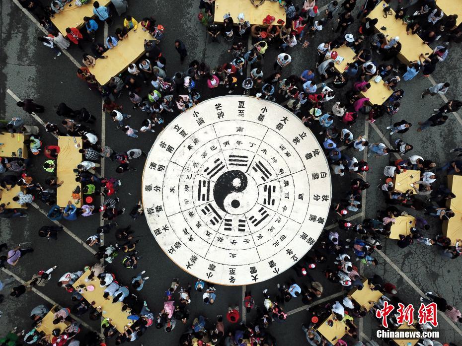 Um total de 1550 quilogramas de soja foram usados para fazer um tofu de 3500 quilos, decorado com caracteres chineses, símbolos dos 24 termos solares, e com o símbolo “yin e yang”. A 19 de maio de 2018, cerca de 10 mil visitantes compartilharam o alimento na montanha Laojun, na cidade de Luoyang, província de Henan, conhecida pela sua herança cultural relacionada com o taoísmo. (Foto: China News Service/Wang Zhongju)