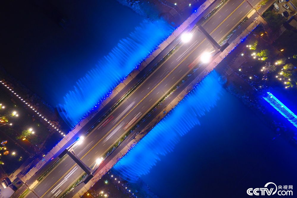 Ponte suspensa Xiaolongwan, no Distrito de Jiangning, em Nanjing, na província de Jiangsu, decorada com um sistema de iluminação colorida, a 4 de junho de 2018. Graças ao show de luzes e ao sistema de pulverização de água, esta ponte de 1,064 metros tornou-se uma atração local.