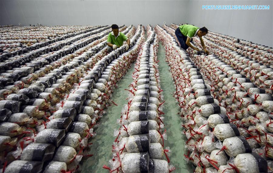 Trabalhadores empilham sacos de composto de cogumelo em uma empresa agrícola no distrito autônomo Miao de Songtao em Tongren, província de Guizhou, no sudoeste da China, em 20 de junho de 2018. Os agricultores locais são incentivados a cultivar fungos comestíveis em composto orgânico feito a partir de resíduos agrícolas, como caules, pedaços de madeira e cascas de sementes de algodão. (Xinhua/Long Yuanbin)