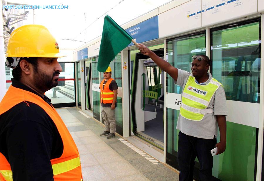 O veículo leve sobre Trilhos Mecca é testado em Meca, Arábia Saudita, em 20 de junho de 2018. A China Railway Construction Corporation (CRCC) iniciou na quarta-feira os testes do veículo leve sobre trilhos Mecca em preparação para a peregrinação do Hajj em agosto, quando milhões de peregrinos visitam a cidade mais sagrada do Islã. (Xinhua/Dong Liwei)