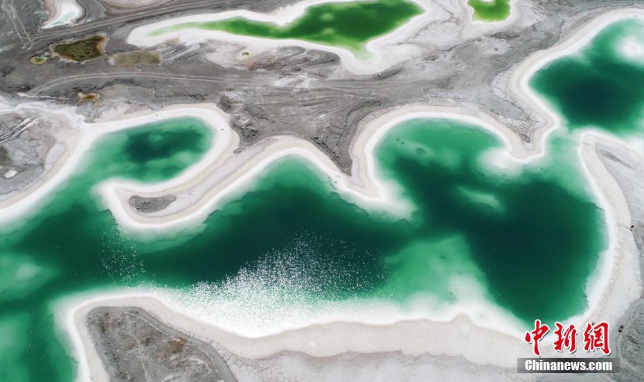 Fotos aéreas monstram o lago salgado de Da Qaidam, na sub-região autônoma mongol-tibetana de Haixi, província de Qinghai, a 25 de julho de 2018. O lago, com seis quilômetros quadrados, foi formado após anos de mineração, resultando na elevada concentração de sal das águas. Devido à sua cor, contra o céu azul e as montanhas cobertas de neve, foi então denominado Lago Esmeralda.