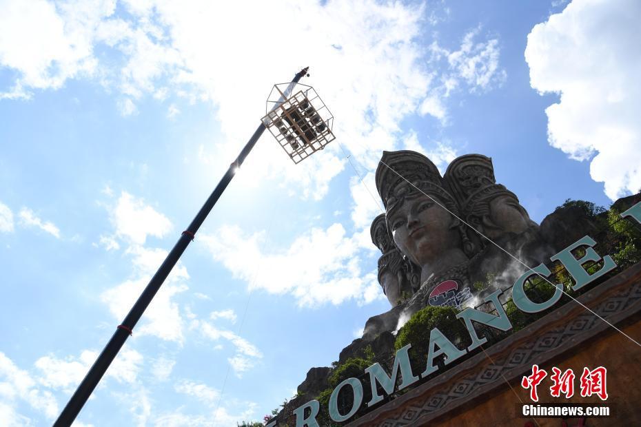 Grupo de turistas domésticos e internacionais desfrutam juntos de macarrão de arroz em um restaurante transparente suspenso no ar, em Guilin, a 29 de julho. O restaurante, com um peso de 5 toneladas, foi levantado até uma altura de 50 metros do solo por uma grua de 100 toneladas. Entretanto, dois grupos de turistas participantes desistiram da sua refeição quando o “restaurante” atingiu uma altura de 10 metros, por motivos de medo.