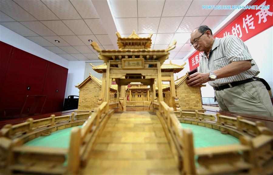 Zhang Xiaocheng observa maquete de construção antiga feita de varas de madeira descartadas no distrito de Chengguan, na cidade de Wu'an, província de Hebei, norte da China. Zhang fez mais de 60 artesanatos usando varas de madeira descartadas. (Xinhua/Wang Xiao)