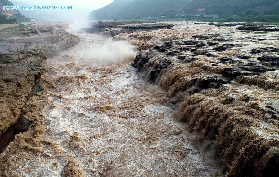 Fotos aéreas de 4 de agosto de 2018 mostram a Cachoeira Hukou do Rio Amarelo durante o período de cheias na seção do distrito de Jixian de Linfen, província de Shanxi, no norte da China. (Xinhua/Liu Hongda)