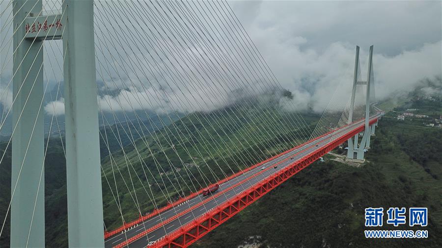 Ponte de Beipanjiang envolta em nuvens, na junção das províncias de Guizhou e Yunnan, no sudoeste da China. A ponte conta com uma extensão de 720 metros e uma altura de 565 metros acima do fundo do vale.