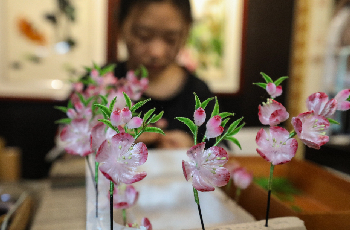 Ronghua, ou as flores de veludo de Nanjing, é um tipo de decoração de gancho de cabelo das mulheres da antiguidade da China, sendo incluído na lista do patrimônio cultural imaterial da China. O adereço tem um significado de felicidade e de vida auspiciosa. Nas dinastias de Ming e Qing, as mulheres costumavam colocar as flores no cabelo durante os festivais e momentos importantes. (Xinhua/Xi Hangfei Guo Jiahao Li Zerui)