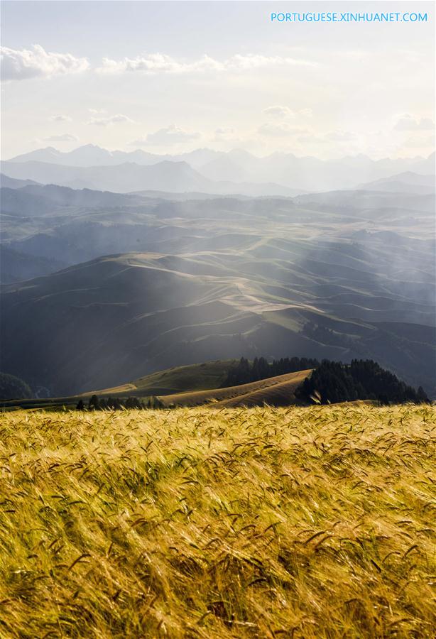 Foto de 26 de agosto de 2018 mostra uma lavoura de trigo maduro em um parque agrícola na Sub-região Autônoma Cazaque de Mori, Região Autônoma Uigur de Xinjiang, no noroeste da China. (Xinhua/Zhao Ge)
