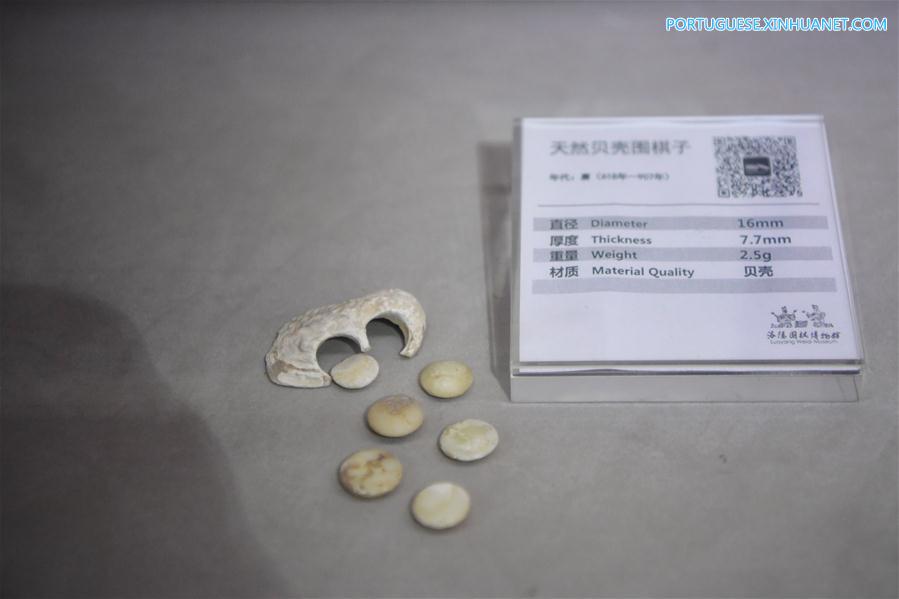 Peças de GO feitas de semente em exposição no Museu de Go (Weiqi) em Luoyang, província de Henan, no centro da China, em 5 de setembro de 2018. O museu privado exibe mais de 25.000 artigos relacionados ao jogo Go na China. (Xinhua/Feng Dapeng)