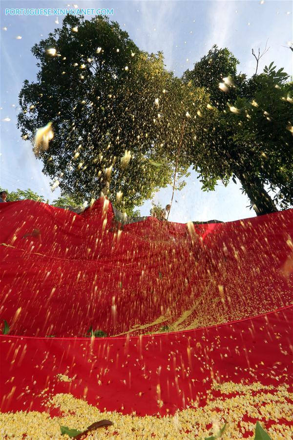 Aldeões coletam osmanthus adocicado na aldeia Fangting do distrito de Anxi, província de Fujian, sudeste de China, em 18 de setembro de 2018. O osmanthus adocicado é utilizado pelo povo local para fazer chá, bolo e vinho. (Xinhua/Zhang Jiuqiang)