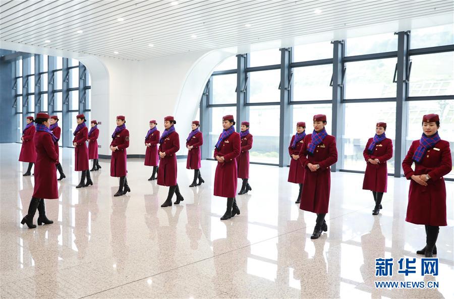 As tripulantes de trem-bala da China Railway Chengdu Group participam de um curso de formação, a fim de oferecer melhores serviços aos passageiros durante o período atarefado do Festival da Primavera de 2019.