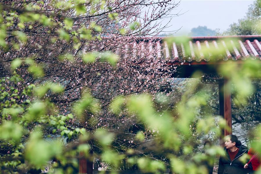 Flores de ameixa são vistas no Templo Lianyang em Fuzhou, província de Fujian, no sudeste da China, em 10 de fevereriro de 2019. A paisagem florida tem atraído muitos turistas. (Xinhua/Jiang Kehong)