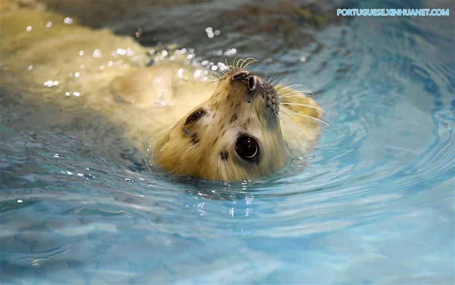 Fotos mostram um filhote de foca e sua mãe no parque temático Harbin Polarland, na província de Heilongjiang, nordeste da China. A foca "Sha Sha" deu à luz um filhote no Harbin Polarland. (Xinhua/Wang Jianwei)