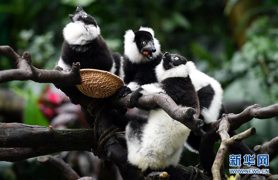 Trigêmeos de varecia-preto-e-branco se alimentam em galhos de árvores no Chimelong Safari Park em Guangzhou, capital da província de Guangdong, sul da China, em março de 2019. Os primeiros trigêmeos de varecia-preto-e-branco da China foram apresentados ao público depois de quase 10 meses de cuidados intensivos desde o nascimento. O varecia-preto-e-branco é listado como uma espécie criticamente em perigo de extinção pela União Internacional para a Conservação da Natureza (IUCN, em inglês). (Xinhua/Liu Dawei)