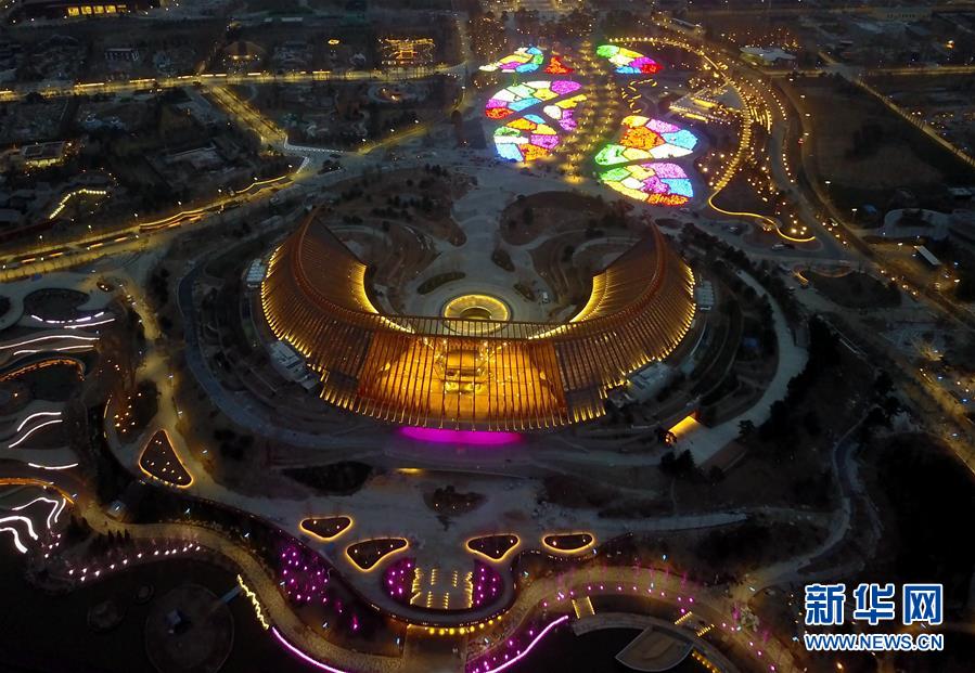 Vista noturna do sítio de Exposição Internacional de Horticultura de Beijing