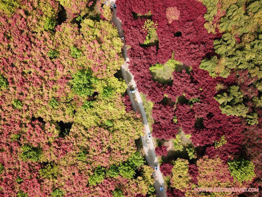 Fotos mostram turistas observando folhas de bordo vermelho na aldeia Shijiaqiao, província de Zhejiang, leste da China, em 17 de abril de 2019. (Xinhua/Weng Xinyang)