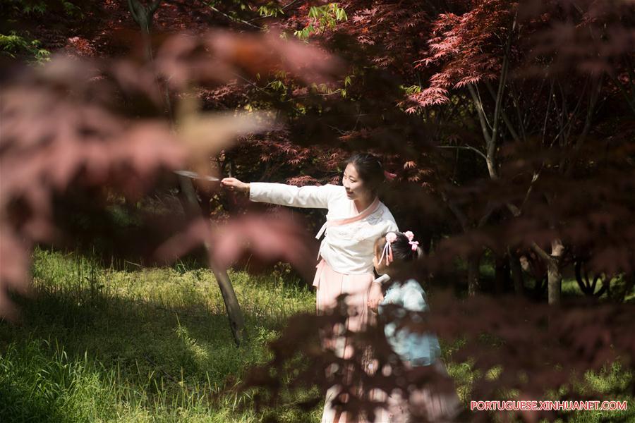 Fotos mostram turistas observando folhas de bordo vermelho na aldeia Shijiaqiao, província de Zhejiang, leste da China, em 17 de abril de 2019. (Xinhua/Weng Xinyang)