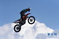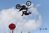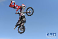 Motoristas apresentam técnicas de freestyle motocross durante um campeonato mundial da modalidade realizado em Daqing, da província de Heilongjiang, nordeste da China.