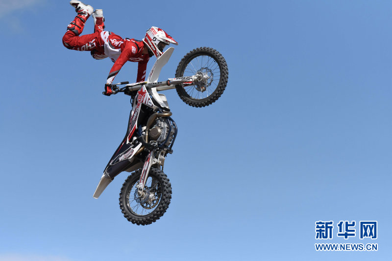 Motoristas apresentam técnicas de freestyle motocross durante um campeonato mundial da modalidade realizado em Daqing, da província de Heilongjiang, nordeste da China.