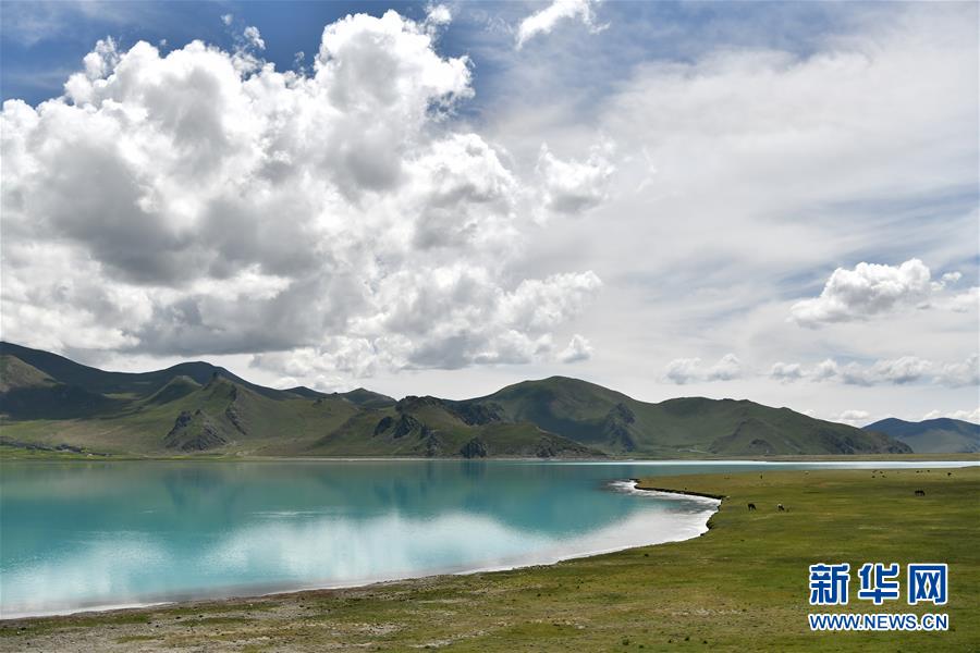 Paisagem outonal do lago Yamzbog Yumco no Tibet na China