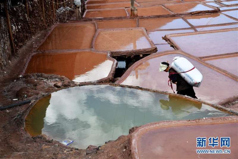 A foto mostra um morador trabalhando no campo de sal no município de Naxi, região autônoma do Tibete. Esta forma de extrair sal evaporando salmoura ao sol vem desde a Dinastia Tang (618-907 DC). As técnicas tradicionais de arejar o sal foram passadas e preservadas nas salinas do município.