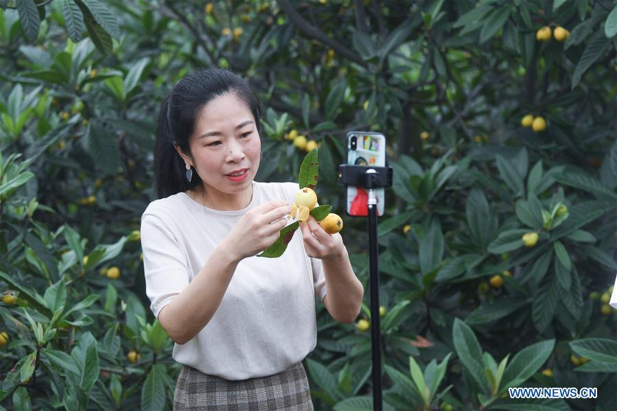 Agricultores aprendem as técnicas de transmissão ao vivo para promover a venda de nêspera via plataforma de comércio eletrônico