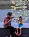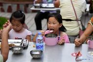 As crianças jantam em um assentamento temporário no distrito de Zhoutou, província de Anhui, leste da China, dia 14 de julho de 2020. Devido às enchentes, cerca de 300 moradores da aldeia de Sizhou foram deslocados para um assentamento temporário em uma escola primária.
