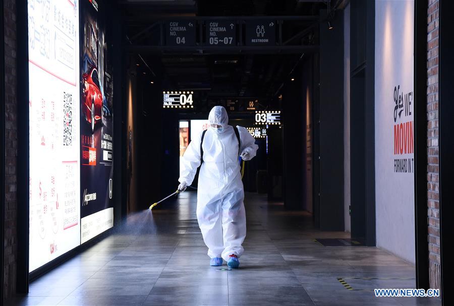 Os cinemas nas áreas de baixo risco foram autorizados a retomar suas operações a partir de 20 de julho, após a melhoria da epidemia de Covid-19, anunciou a Administração de Filmes da China. Várias medidas de prevenção devem ser adotadas pelas salas. Entre elas, a desinfecção das instalações, como está em Handan, província de Hebei, norte da China.