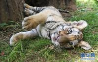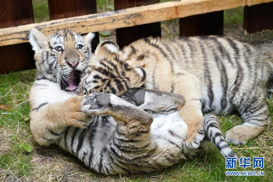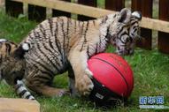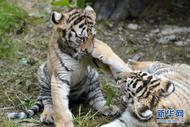 Filhotes de tigre siberiano brincam no parque em Hailin, Heilongjiang